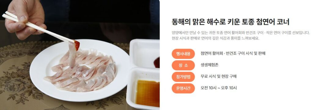 소비자 참여 프로그램 : 토종 첨연어 시식, 간식놀이터, 스탬프 투어 ‘양양연어 탐험대’, 양양해변 아크릴돔 만들기 등 11종 이상의 체험프로그램