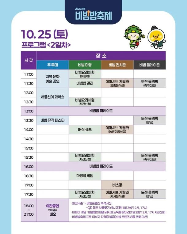 2025 축제에서는 버스킹, 비빔퍼레이드, 스타쉐프 마스터클래스, 플래시몹이 포함된 비빔 공연, 야간 공연, 각종 이벤트 등 다양한 공연 및 행사가 준비된다.