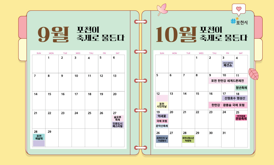 이번 가을에는 △포천 한탄강 세계드론제전 △포천시민의 날 △한탄강·광릉숲 국제포럼 △포천 산정호수 명성산 억새꽃축제 △포천 펫스타 등 다양한 행사가 열려 지역의 관광자원과 문화를 널리 알리고, 지역경제 활성화에도 보탬이 될 것으로 기대된다.