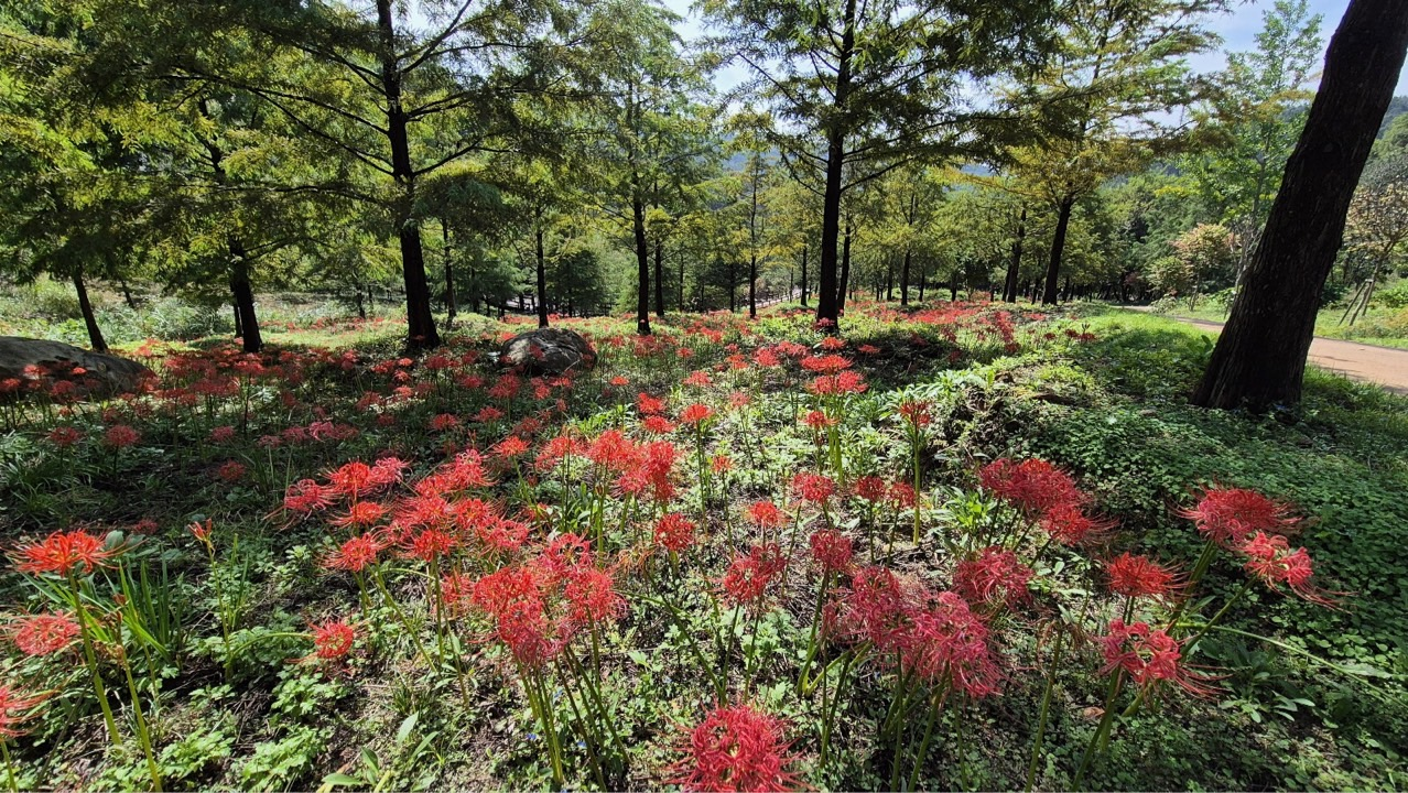 중구 보문산 자락의 무수동 치유의 숲(무수동 195)은 숲속 고요함과 꽃무릇이 조화를 이루는 힐링 공간이다. 모두숲길(1.5km), 운동치유길(2.7km), 물길 산책로(1.5km) 등 다양한 코스를 따라 걸을 수 있고, 산림치유지도사가 함께하는 프로그램도 운영돼 자연 속 치유 효과를 체험할 수 있다.