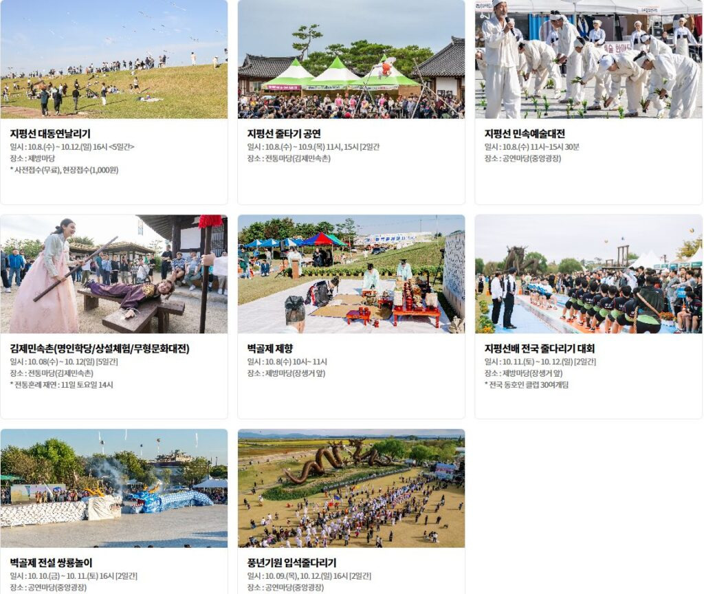 우리나라 최고(最古), 최대(最大) 수리시설인 김제 벽골제를 중심으로 전통농경문화를 주제로 개최하는 김제지평선축제가 2025년 10월 8일부터 12일까지 5일간 전북 김제시 벽제골 일원에서 개최합니다.