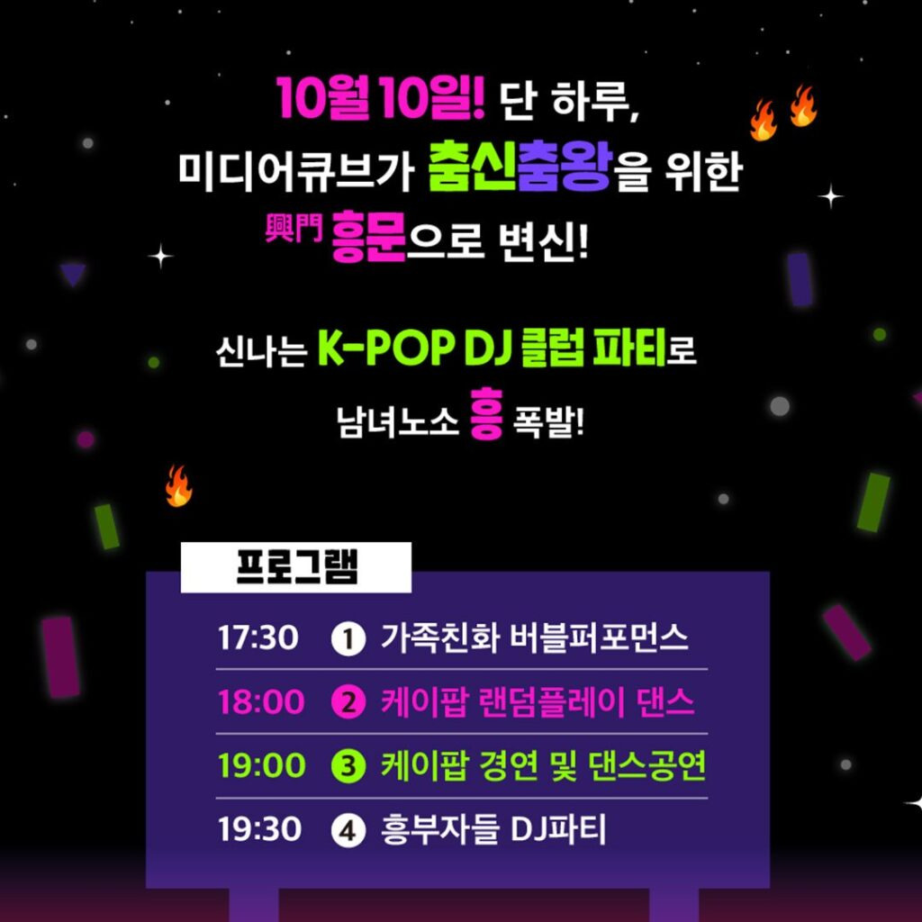 10월 10일(금) 도시상징광장에 K-POP 랜덤플레이댄스 및 공연, DJ파티 등 세대를 아우르는 흥겨운 무대로 세종 흥이나유 텐텐클럽이 개최합니다.