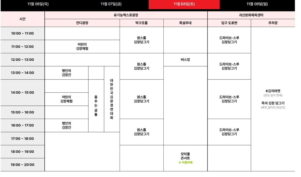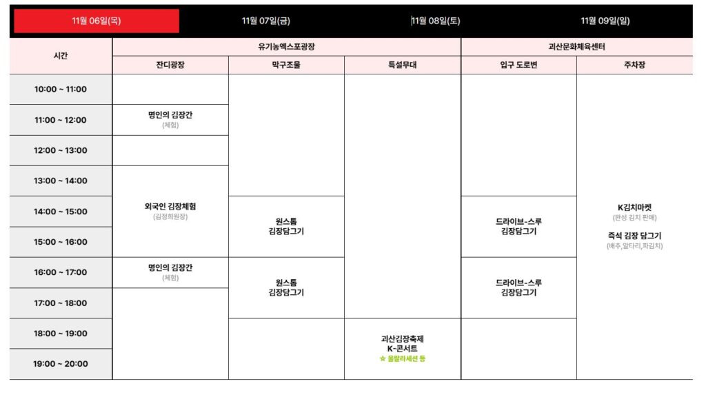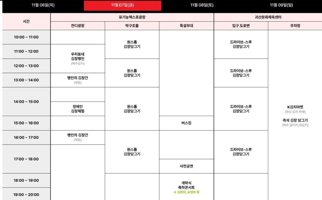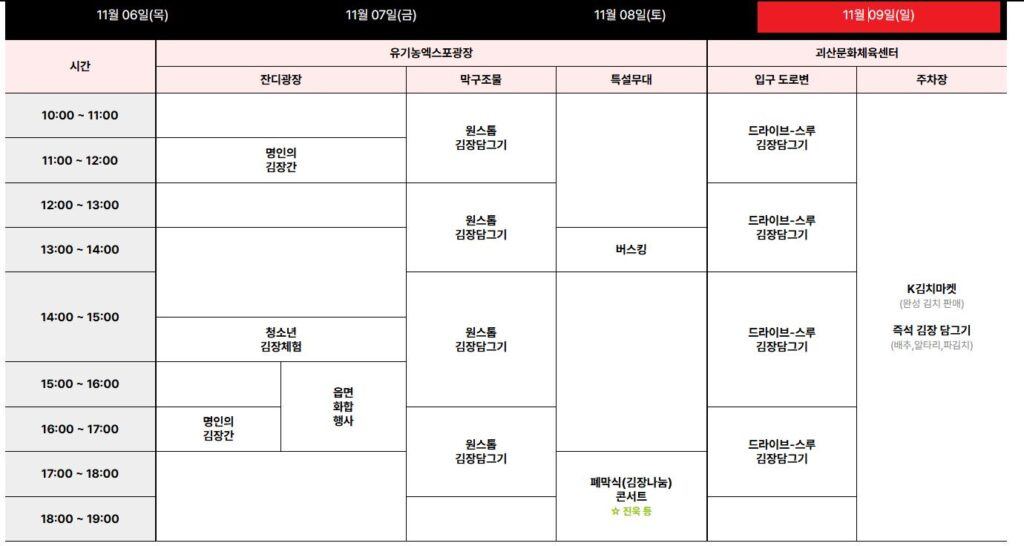축제 기간동안 방문객들은 원스톱 김장담그기, 드라이브스루 김장담그기, 즉석 김장 체험 등 다양한 방식의 김장을 체험할 수 있다.