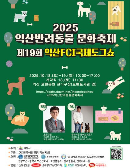 익산시는 오는 18~19일 모현공원 잔디구장에서 ‘2025 익산 반려동물 문화축제 및 제19회 익산 FCI 국제 도그쇼’를 개최한다고 13일 밝혔다.