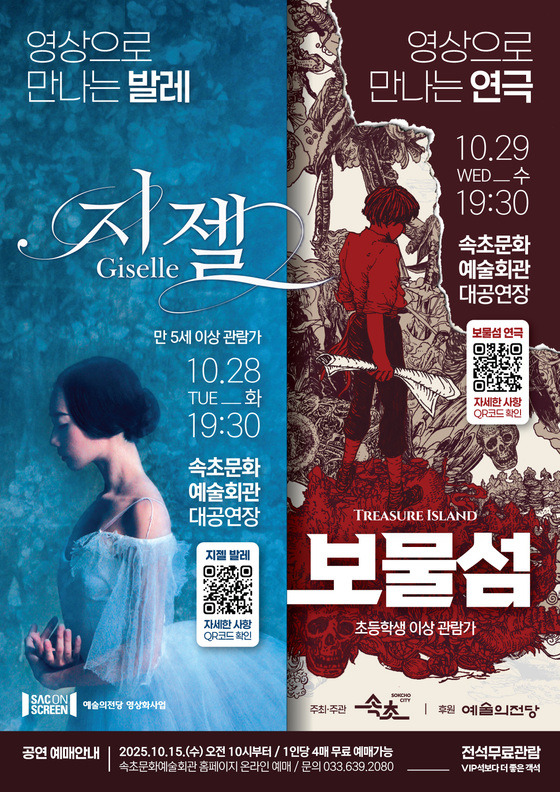 상영작은 △발레 ‘지젤’(10월 28일 화 19시 30분) △연극 ‘보물섬’(10월 29일 수 19시 30분)이다.