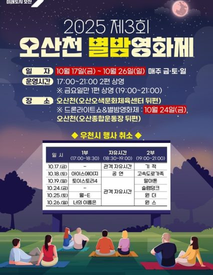 오산시(시장 이권재)는 오는 10월 17일부터 26일까지 매주 금·토·일 저녁, 오산천(오색문화체육센터 뒤편)에서 시민들이 야외에서 영화를 즐길 수 있는 「2025 제3회 오산천 별밤영화제」를 개최한다고 밝혔다.