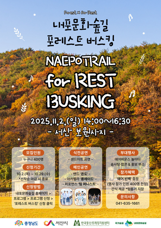 충남도와 사단법인 내포문화숲길은 다음 달 2일 오후 2시 서산 보원사지 일원에서 ‘내포문화숲길 포레스트 버스킹’ 행사를 개최한다고 16일 밝혔다.