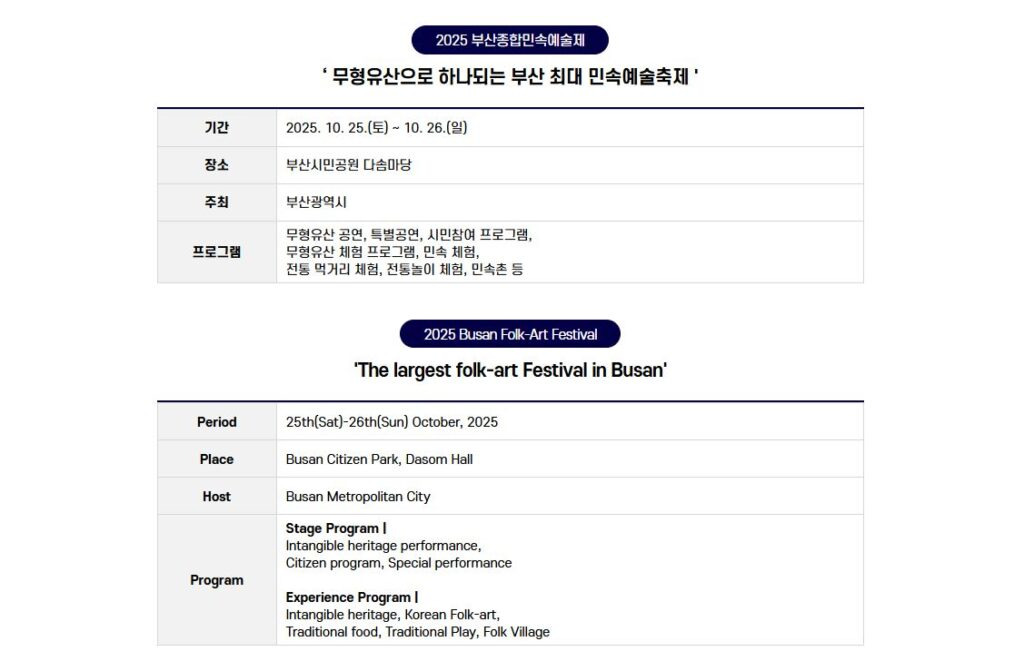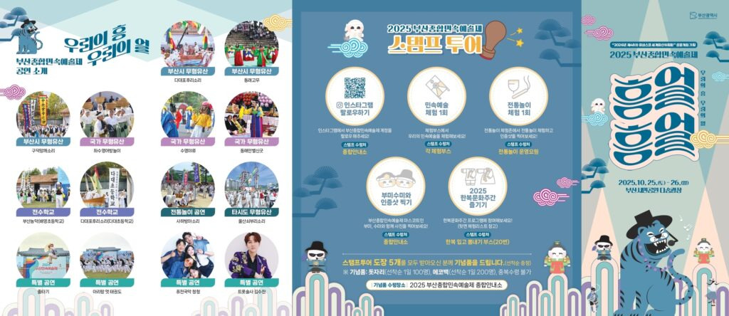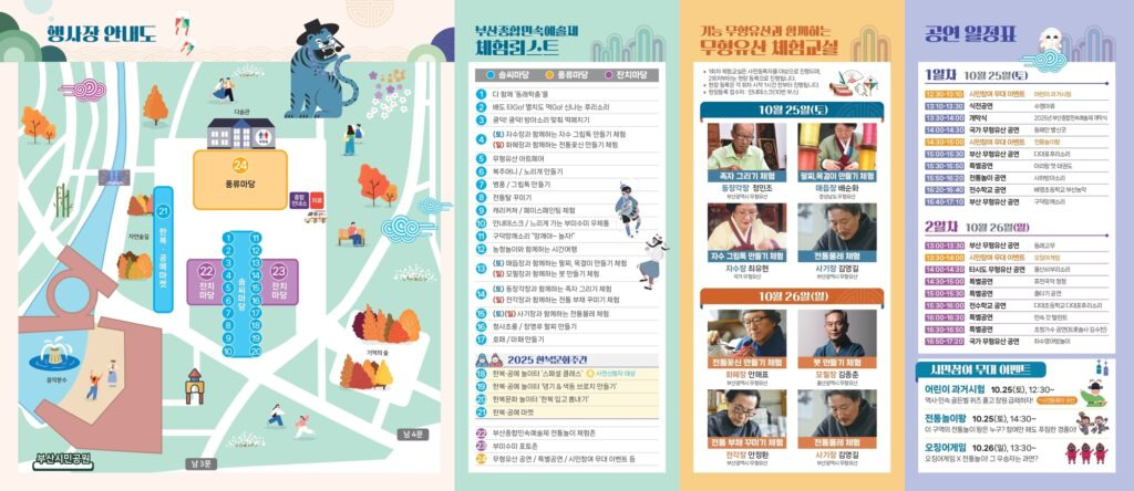 문화유산을 기반으로 한 시민참여형 축제로부산지역 무형문화재뿐만 아니라 타시도 무형문화재를 초청하여 공연 및 체험교실이 펼쳐지는 부산종합민속예술제가 2025년 10월 25일부터 26일까지 개최합니다.