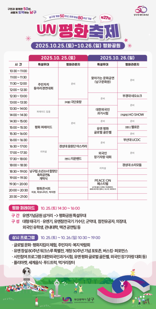 2025년은 남구청 개청 50주년과 유엔 창설 80주년을 맞아 세계적 연대와 미래지향적 비전을 담아내는 평화를 즐기는 축제의 장으로 마련하고 유엔 참전국의 숭고한 희생을 기리고 감사하는 내용을 담았습니다.