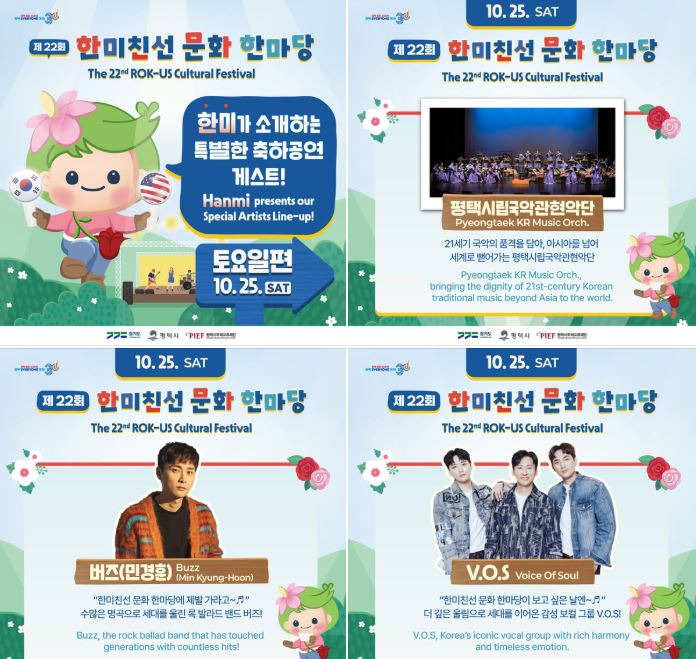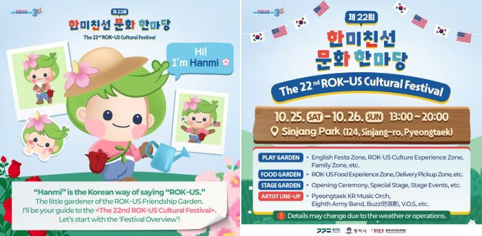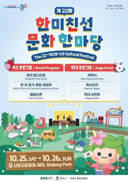 경기도와 평택시가 주최하고 평택시국제교류재단이 주관하는 제22회 한미친선 문화 한마당 축제가 오는 10월 25일부터 26일까지 양일간 신장근린공원 일원에서 개최합니다.