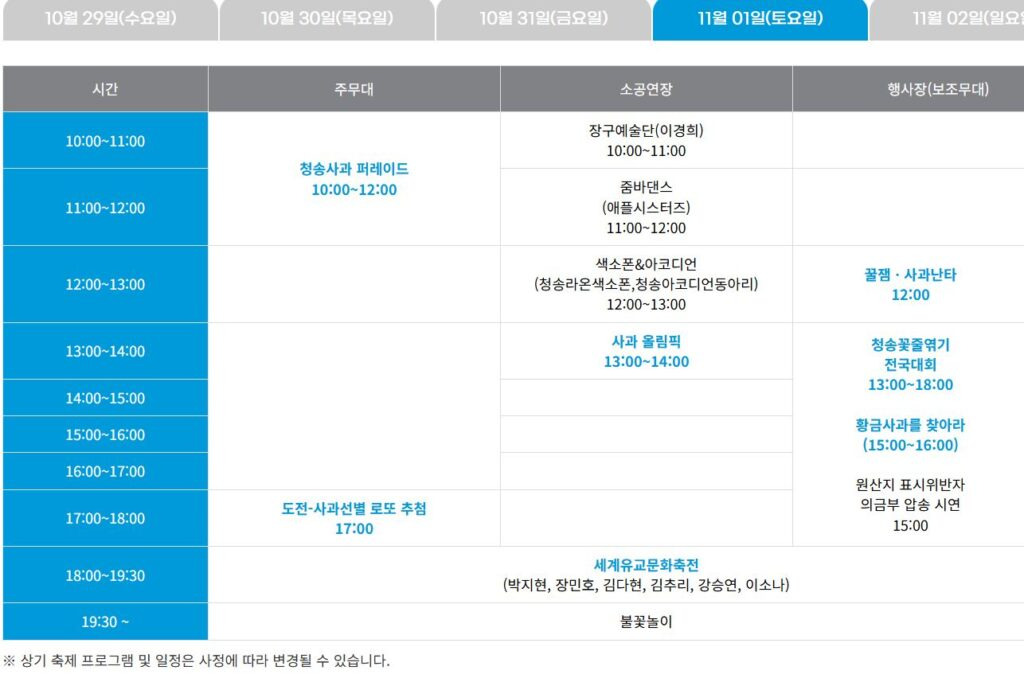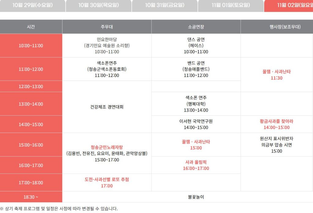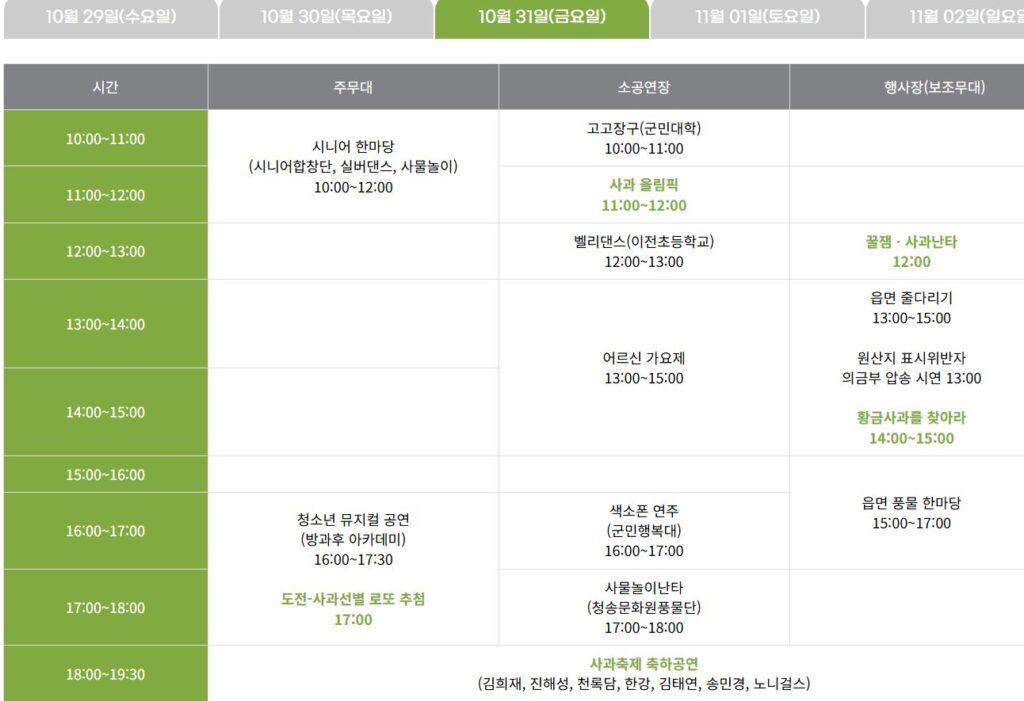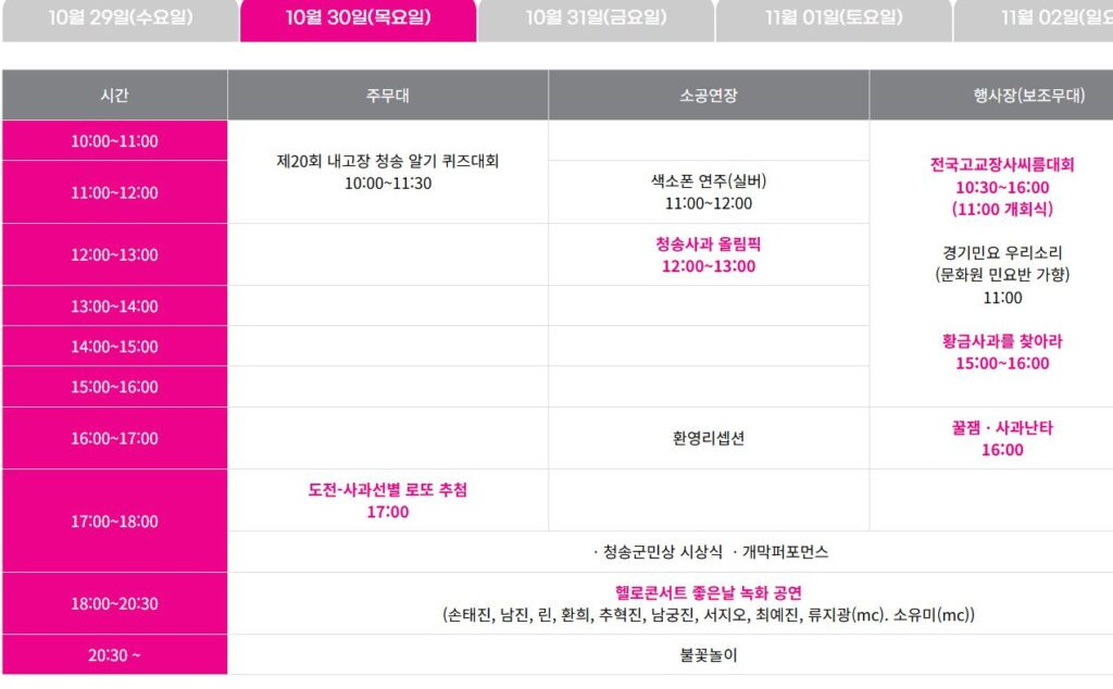 주요프로그램 : 청송사과 퍼레이드, 청송사과 꽃줄엮기 전국대회 등