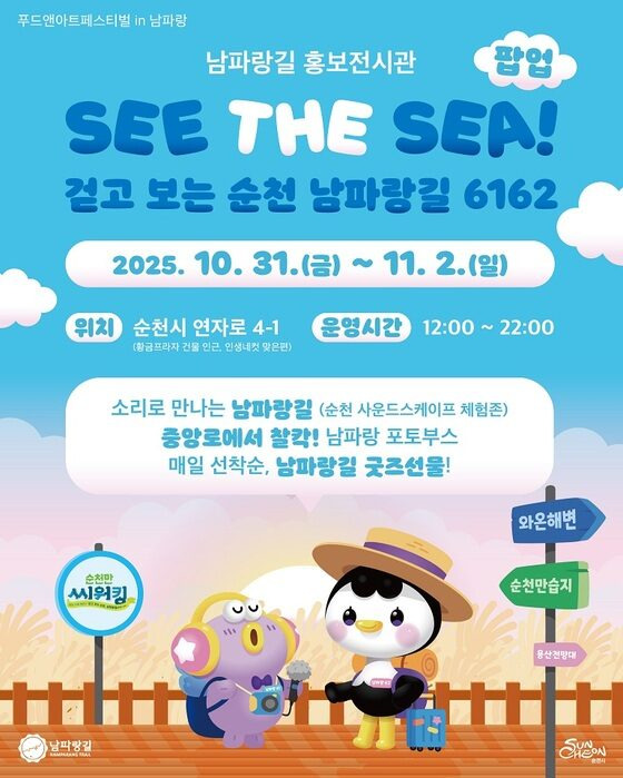 순천시(시장 노관규)는 푸드앤아트페스티벌이 열리는 중앙로 일대에 남파랑길 홍보 전시관을 운영해 순천의 바다와 길을 ‘소리’로 만나는 감각적인 공간을 마련한다고 밝혔다.