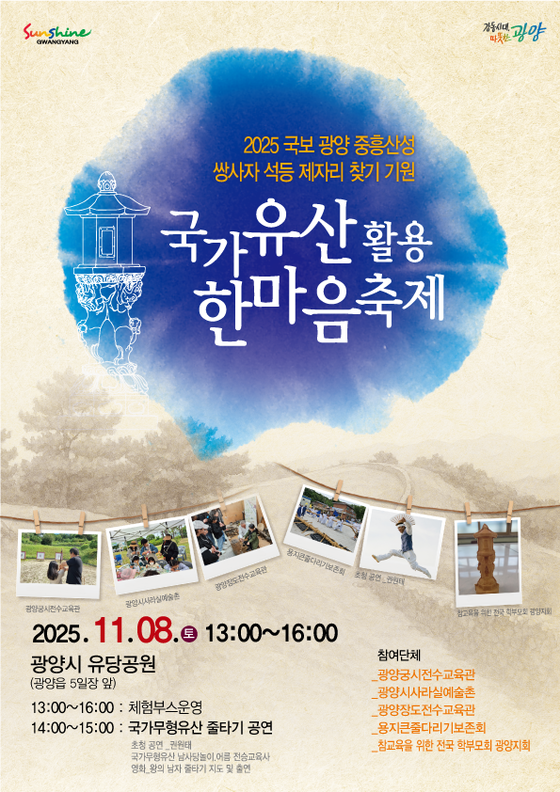 김명덕 문화예술과장은 “이번 국가유산 활용 한마음 축제는 시민과 함께 광양의 국가유산이 지닌 가치를 되새기고, 쌍사자 석등 제자리 찾기의 의미를 공유하는 뜻깊은 자리”라며 “앞으로도 지역의 문화유산을 활용한 다양한 프로그램을 통해 광양의 역사와 문화를 널리 알리겠다”고 말했다.