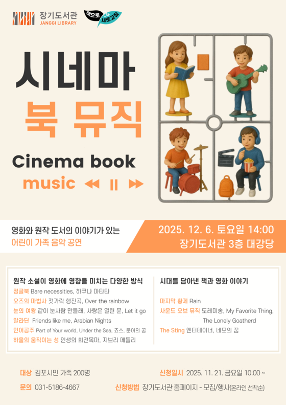 김포시 장기도서관(시장 김병수)은 오는 12월 6일(토) 오후 2시, 장기도서관 대강당에서 가족 인문학 콘서트 시네마 북 뮤직을 운영한다고 밝혔다.