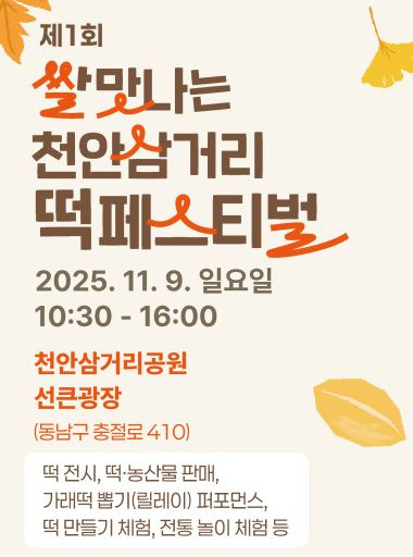 김석필 천안시장 권한대행 부시장은 “갈수록 적게 소비되고 있는 쌀을 소비 촉진하고 활용할 수 있는 떡 축제로 쌀 산업 육성의 계기를 마련하고자 한다”며 “새롭게 개장한 천안삼거리공원에서 천안 쌀로 만든 떡과 다양한 가공식품을 즐겨보시길 바란다”고 말했다.