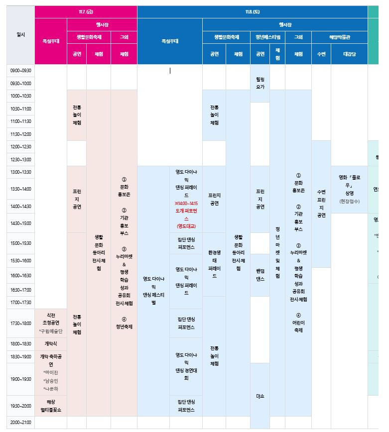바지선 버스킹 무대, 도개 플래시몹, 문화도시영도 브랜드관, 시대거리, 대한도기전시, 영도점빵 등이 펼쳐질 예정입니다.