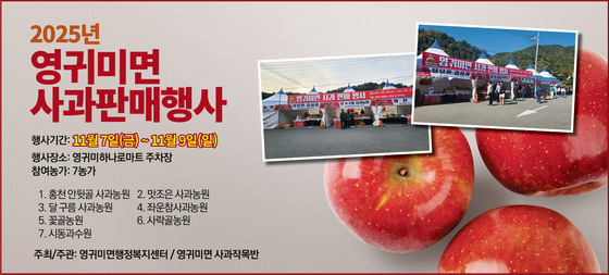 홍천군 영귀미면은 11월 7일(금)부터 9일(일)까지 3일간 오전 9시부터 오후 5시 30분까지 영귀미면 하나로마트 주차장에서 사과 판매 행사를 개최한다고 밝혔다.