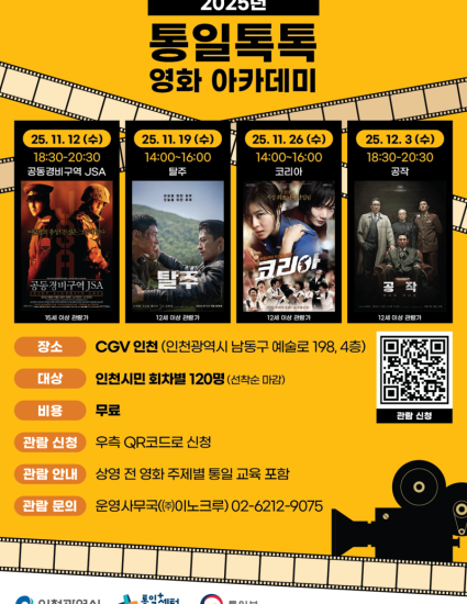 한편,‘통일톡톡 영화아카데미’는 인천 시민 누구나 참여할 수 있으며 참가비는 무료다. 참가 신청은 인천통일플러스센터 누리집(https://www.unipluscenter.go.kr)과 포스터 내 정보무늬(QR코드)를 통해 가능하며, 1회당 최대 2명까지 신청 가능하다.