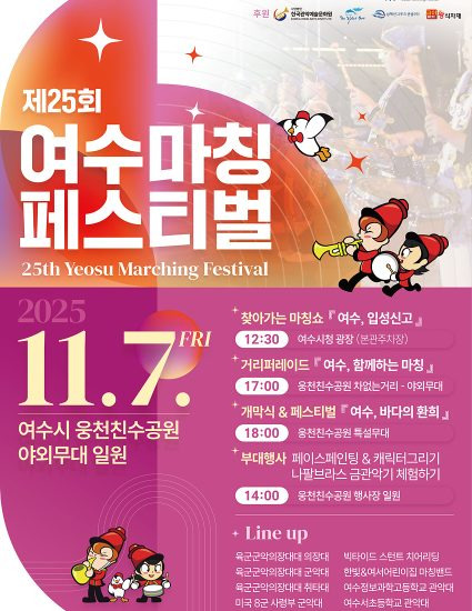 여수시(시장 정기명)는 오는 11월 7일(금) 오후 6시 웅천친수공원에서 대한민국 3대 관악제 중 하나인 ‘여수마칭페스티벌’을 개최한다.
