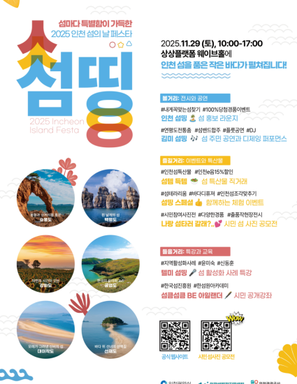 인천광역시(시장 유정복)는 오는 11월 29일 상상플랫폼 웨이브홀에서 ‘2025 인천 섬의 날 페스타 – 섬띵(Seom-thing)’을 개최한다고 밝혔다.