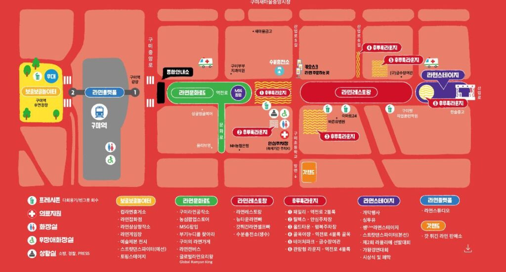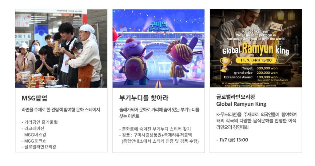 축제 첫날인 11월 7일에는 구미역 1층 ‘영스퀘어’ 내에 ‘구미라면홍보관 – GUMI RAMYUN STATION 475’가 문을 연다. 이곳은 연말까지 상설 운영되며, 시민 참여형 홍보관으로서 축제의 열기를 이어간다. 라면 MBTI, 라면 뽑기, 인생네컷, 영수증 이벤트 등 참여형 콘텐츠와 함께, 특정일에는 감성 어쿠스틱 및 R&B 라이브 공연과 무소음 디제잉 파티가 진행돼 구미역 일대를 문화감성 공간으로 탈바꿈시킬 예정이다.