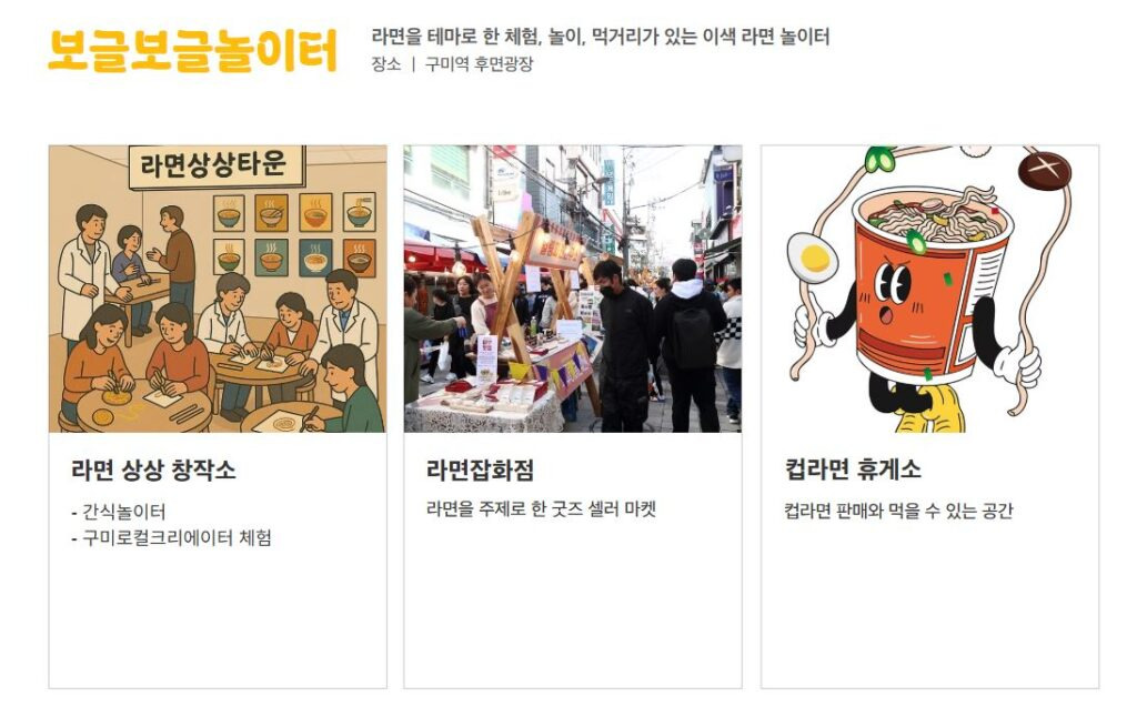 또한 구미역 후면 광장에는 ‘컵라면 휴게소’, ‘보글보글 놀이터’, ‘라면 상상창작소’ 등이 마련돼 아이들과 함께 휴식과 체험을 즐길 수 있는 패밀리형 공간으로 꾸며진다.