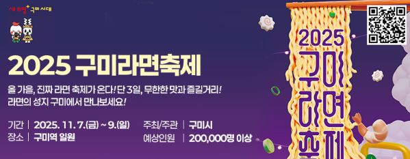 구미시는 오는 11월 7일부터 9일까지 3일간 구미역 일원에서 「2025 구미라면축제」를 연다. 올해 축제는 ‘오리지널(Original)’을 주제로, 세상에서 가장 긴 라면 레스토랑을 중심으로 일상과 상권이 어우러지는 새로운 도시형 라면 문화 축제를 선보인다.