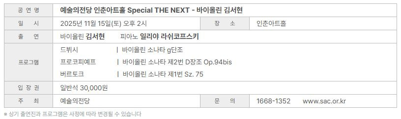 | 인춘아트홀 바이올리니스트 임도경(2025.11.20) (0) | 2025.11.09 |