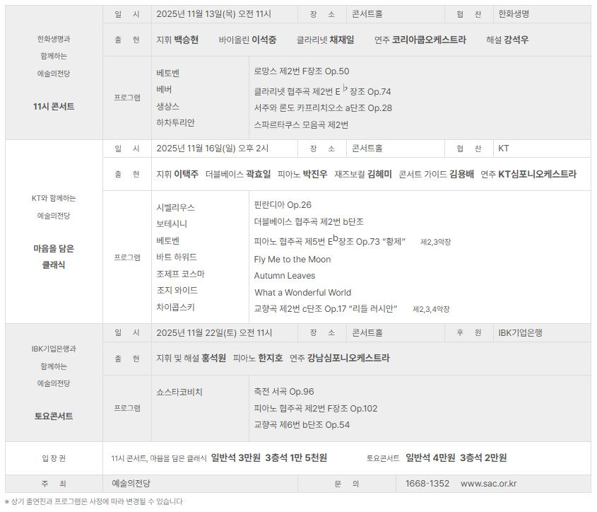 | 인춘아트홀 바이올리니스트 임도경(2025.11.20) (0) | 2025.11.09 |