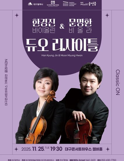 대구콘서트하우스 기획공연 ‘클래식 ON’ 11월 무대는 ‘바이올리니스트 한경진 & 비올리스트 문명환 듀오 리사이틀’로, 오는 11월 25일(화) 오후 7시 30분 챔버홀에서 열린다.