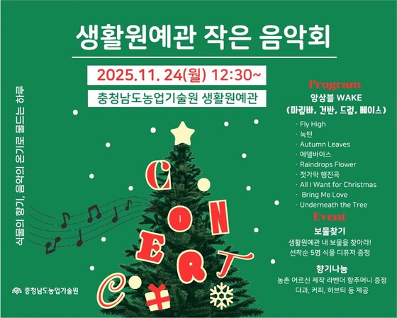 충남도 농업기술원은 오는 24일 예산군 신암면 기술원 내 생활원예관에서 ‘작은 음악회’를 개최한다고 18일 밝혔다.
