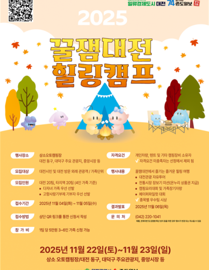 이번 힐링캠프에는 대전 시민 20팀과 타 지역 참가자 20팀 등 총 40팀의 가족단위 참가자들이 참여하며, 전통시장 장보기 미션, 캠핑요리대회, 가족장기자랑, 힐링음악회 등 다채로운 프로그램을 통해 지역문화를 체험하고 가을 정취를 만끽할 예정이다.