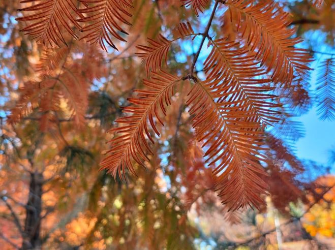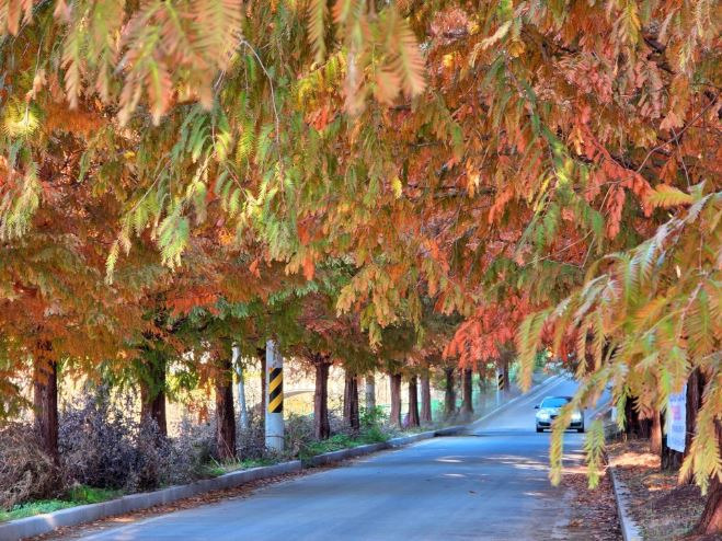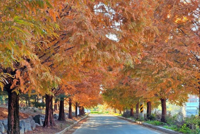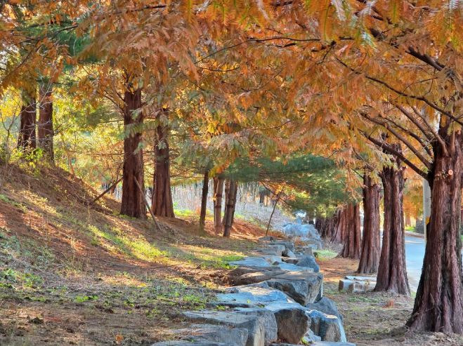 은행나무숲 아래에서는 고요하게 이어지는 메타세궈이어 숲길이 펼쳐집니다.