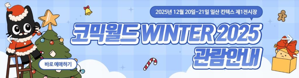 개인 또는 동아리가 직접 만든 창작품(회지, 팬시, 일러스트 등)을 전시하거나 판매할 수 있는 코믹월드 2025가 2025년 11월 29일부터 2026년 1월 11일까지 개최합니다.