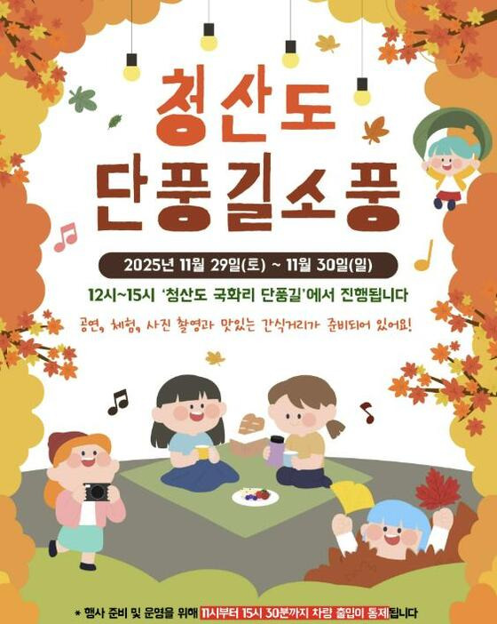 행사는 11월 29일과 30일 오후 12시부터 15시까지 진행되며, 29일에는 차량이 전면 통제돼 주민과 관광객이 안전하고 편안하게 단풍길을 거닐 수 있다.
