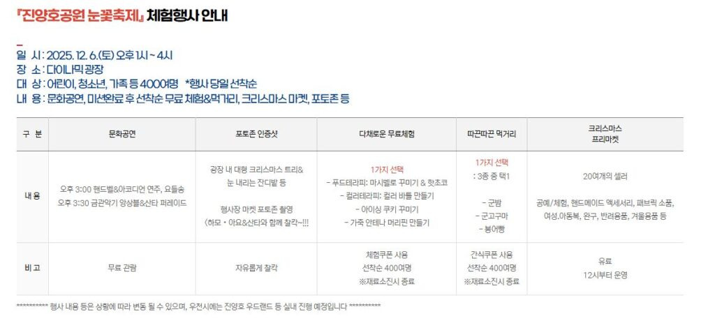 시 관계자는 “진양호공원이 가족 나들이 명소로 자리 잡고 있는 만큼, 아이들에게는 특별한 기억을, 시민들에게는 따뜻한 연말 분위기를 전할 수 있도록 행사를 마련했다”며 “특히 삿갓 난로 비치, 무릎 담요 대여, 주차·차량관리 강화 등을 통해 모두가 편안하고 안전하게 즐길 수 있도록 세심하게 점검하고 준비하고 있다”고 말했다.