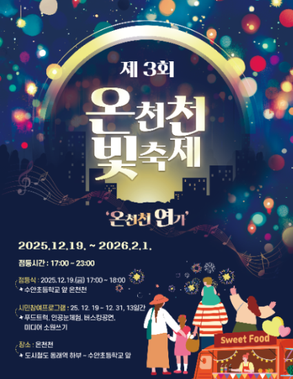 부산 동래구(구청장 장준용)는 오는 19일부터 내년 2월 1일까지 온천천을 겨울 문화와 감성이 넘치는 따뜻한 공간으로 조성하여“제3회 온천천 빛 축제”를 개최한다고 밝혔다.