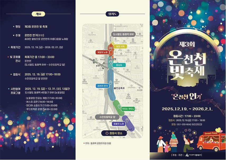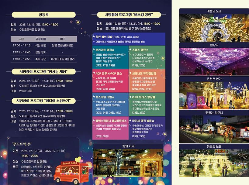 축제 개막을 알리는 점등식은 12월 19일(금) 17:00에 수안초등학교 앞 온천천에서 열리며 이후 12월 31일(수)까지 13일간 동래역 4번 출구 하부 눈꽃광장에서 인공눈 체험 , 버스킹 공연 , 그리고 미디어 소원쓰기 등 풍성한 프로그램이 운영합니다.