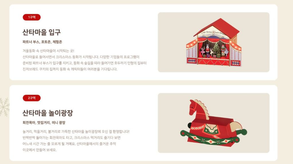 크리스마스 시즌 소품 및 먹거리 소상공인 판매 부스, 기업 협업의 파트너 부스, 포토존과 다양한 체험 이벤트 프로그램으로 산타 마을이 구성됩니다.