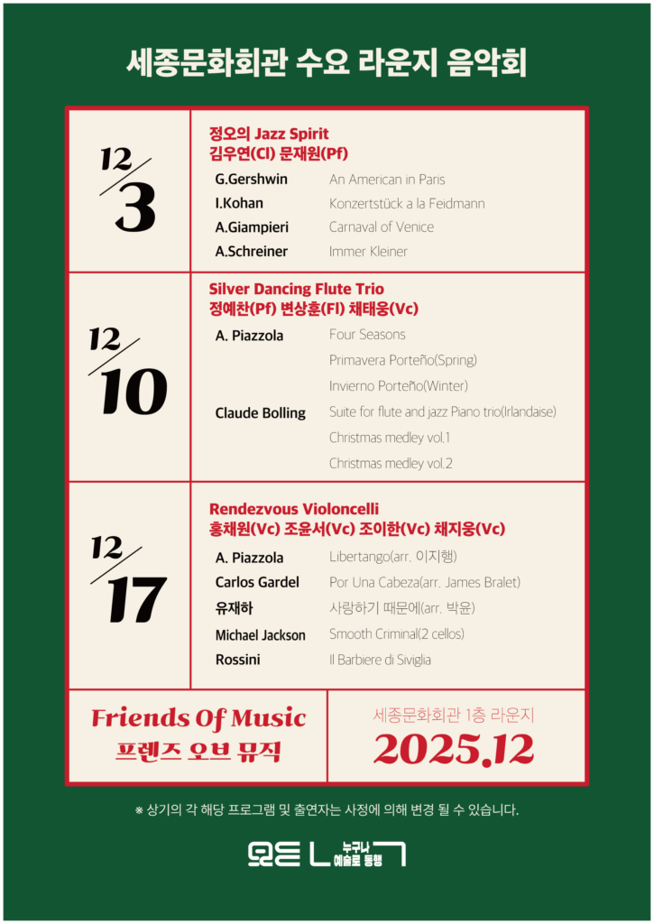 새로운 예술 플랫폼 ‘세종라운지’에서 진행되는 <수요라운지음악회>는 오는 12월, 점심시간을 활용해 특별한 연주를 선보인다. 12월 3일 첫 무대는 ‘정오의 Jazz Spirit’로, 김우연(클라리넷)과 문재원(피아노)이 거슈윈의 「아메리카 인 파리」, 슈라이너의 「임머 클라이너」 등 감각적인 레퍼토리를 들려준다. 10일 두 번째 공연에서는 ‘Silver Dancing Flute Trio’가 무대에 오른다. 정예찬(피아노), 변상훈(플루트), 채태웅(첼로)이 피아졸라 「Four Seasons 중 Spring·Winter」, 크리스마스 메들리 등 활기 넘치는 연주를 선사한다. 17일 마지막 무대는 4첼로 앙상블로 꾸며지며, 홍채원·조윤서·조이한·채지웅 첼리스트가 탱고부터 대중음악, 팝까지 다양한 장르의 곡으로 첼로의 매력을 전하며 연말 분위기를 뜨겁게 달굴 예정이다.