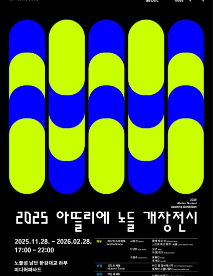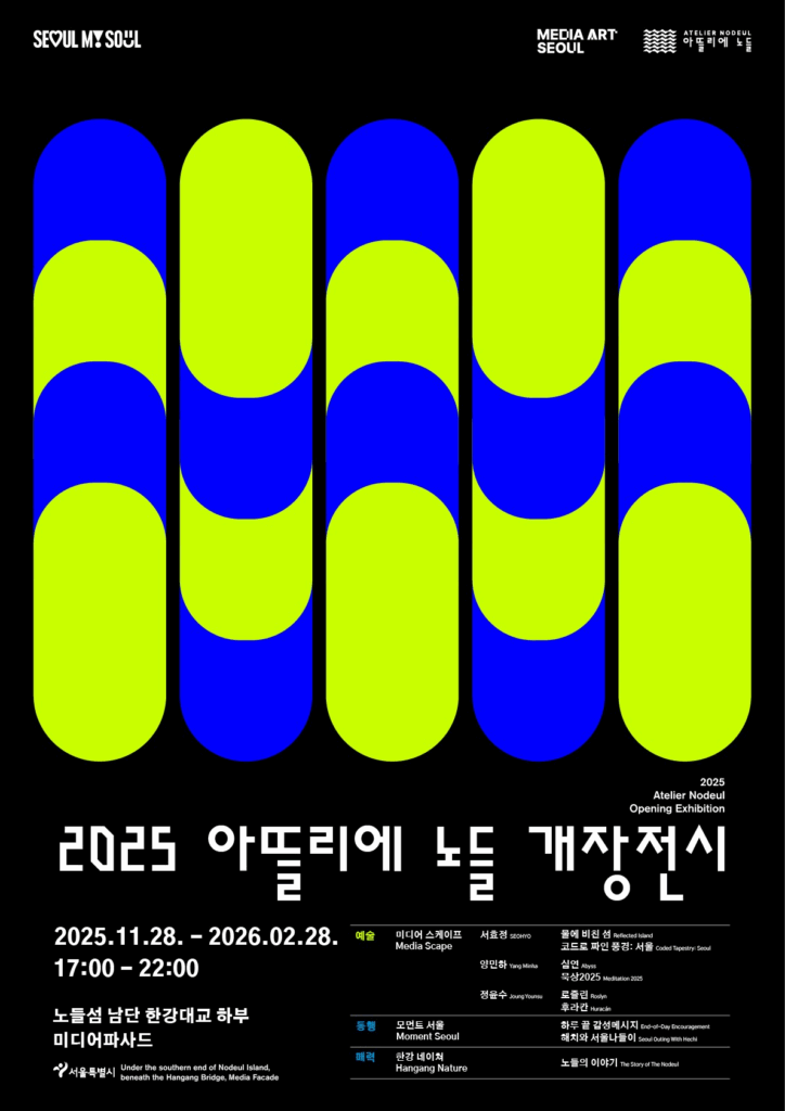서울시는 한강 중심부 노들섬 남단 한강대교 하부에 공공 미디어아트 전시플랫폼 ‘아뜰리에 노들’을 11월 28일 개장하고, 2026년 2월 28일까지 매일 오후 5시부터 10시까지 운영한다고 밝혔다.