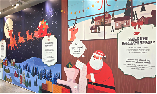 전시는 크리스마스 이야기로 향하는 ‘비밀의 문’에서 시작된다. 타이틀 구조물과 포토존이 설치된 입구를 지나면 본격적으로 동화 속 세계로 들어가게 된다. 이어지는 ‘산타의 선물을 만드는 비밀 공방’에서는 산타와 요정들의 크리스마스를 준비하는 과정을 그래픽과 동화 형식으로 구성했다.