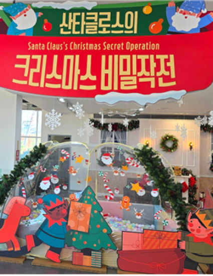 마지막 공간 ‘비밀의 눈밭’에서는 볼풀장을 활용해 하얀 겨울의 정취를 연출했다. 크리스마스 분위기의 그래픽 시트와 요정 캐릭터 등신대를 설치하고, 눈꽃 장식과 조명을 더해 아이들이 눈밭을 뛰노는 듯한 즐거움을 느낄 수 있다.