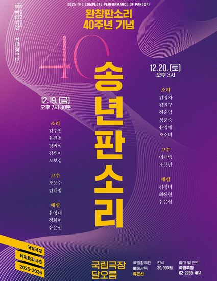 국립극장(극장장 박인건) 전속단체 국립창극단(예술감독 겸 단장 유은선)은 2025년 국립극장 ‘완창판소리’의 송년 무대인 <송년판소리>를 12월 19일(금)~20일(토) 양일간 국립극장 달오름극장에서 선보인다.