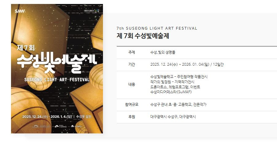 주민주도형 겨울철 대구 대표 빛 축제인 수성빛예술제가 2025년 12월 24일부터 2026년 1월 4일까지 대구 수성못 일대에서 개최합니다.