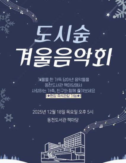 용인특례시 동천도서관은 18일 오후 5시부터 6시까지 동천도서관 지하 1층 책마당(열람형 계단공간)에서 ‘도시숲 겨울 음악회’를 연다고 밝혔다.