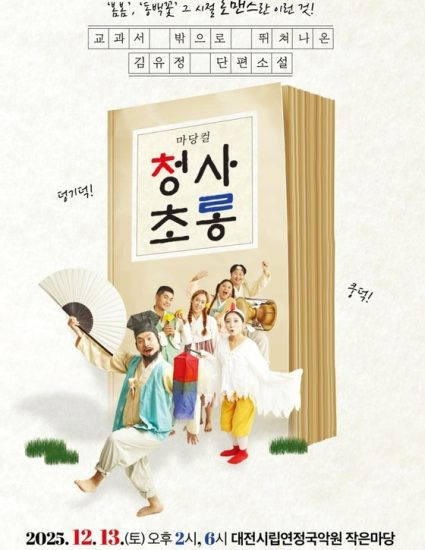 대전시립연정국악원(이하 국악원)은 친구, 연인 그리고 온 가족이 함께 즐겁고 유쾌하게 볼 수 국악융합극‘청사초롱’을 13일(토) 14시와 18시에 국악원 작은마당에서 개최한다.