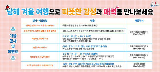남해군은 겨울 여행 관광객 유치와 체류형 관광 활성화를 위하여 다양한 매력적인 행사 ․ 이벤트를 개최한다.