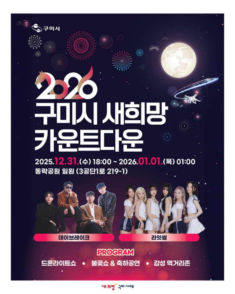 2026 구미시 새희망 카운트다운 행사가 2025년 12월 31일부터 2026년 1월 1일까지 구미시 동락공원 광장에서 개최합니다.