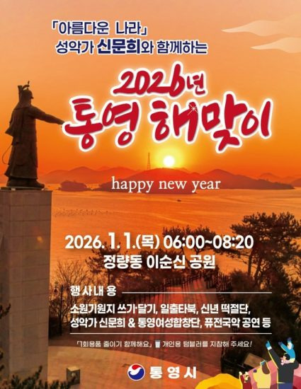 통영시(시장 천영기)는 2026 병오년(丙午年) 붉은 말의 해를 맞아 2026년 1월 1일(목) 오전 6시부터 정량동 이순신공원에서 새해 해맞이 행사를 개최한다.